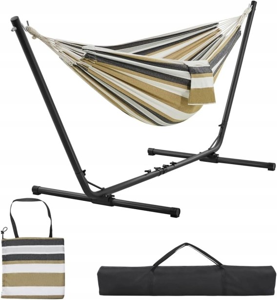 Zestaw ten zawiera podwójny hamak, solidną metalową ramę, torbę do przechowywania huśtawki i torbę transportową. Ciesz się czasem wolnym na świeżym powietrzu i zrelaksuj się!