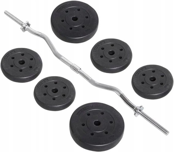Sztanga z ciężarkami: Ten zestaw ciężarków do sztangi zawiera cztery talerze 2,5 kg, dwa talerze 5 kg, jeden drążek do ćwiczeń i jedną parę kołnierzy z blokadą gwiazdową.